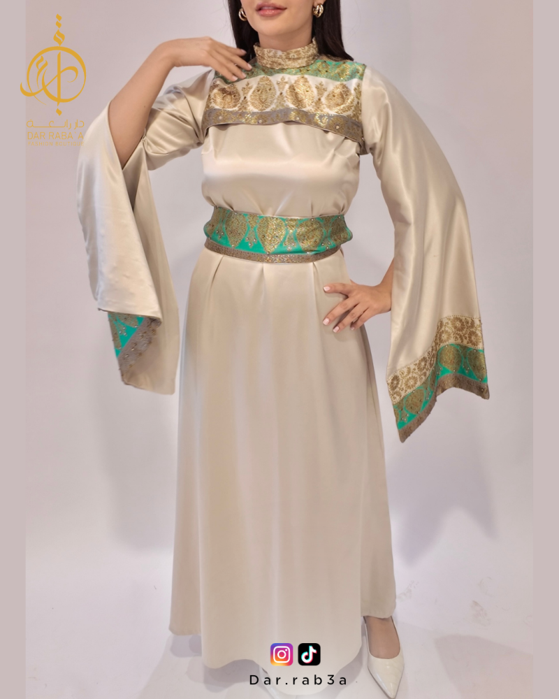 جلابية اماراتي نسائي هي خيارك الأمثل و تصميمها الرائع من قماش التفتة التركي عالي الجودة مع لمسة من الجُرُز الهندي المزين من دار رابعة للازياء.