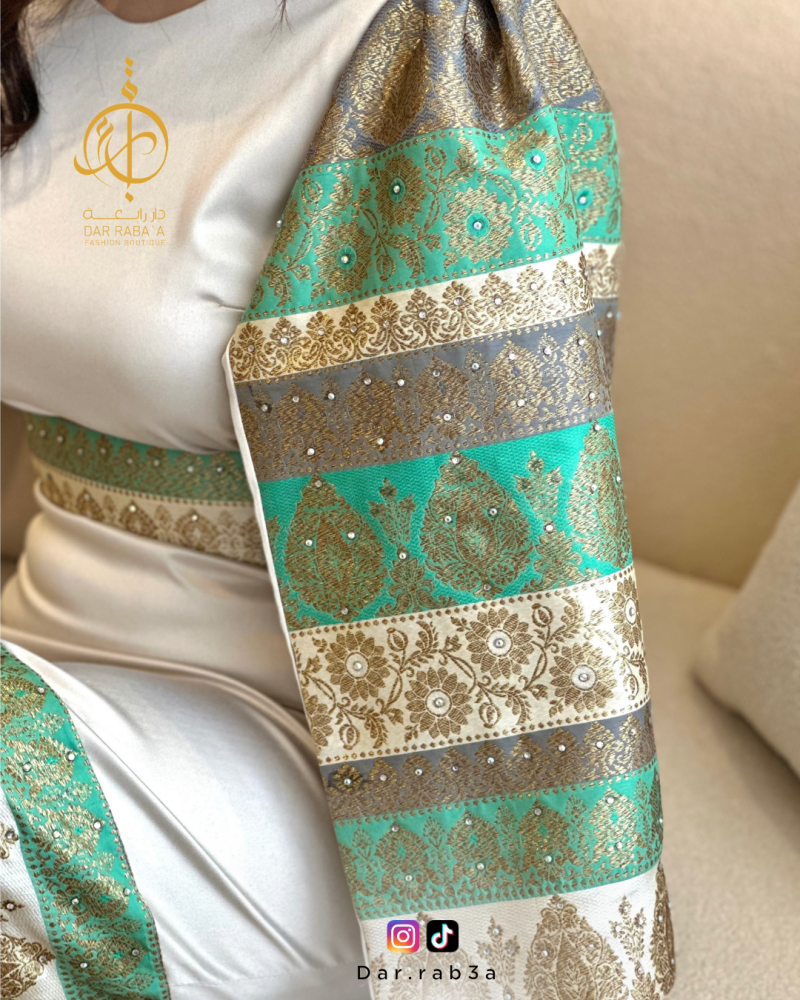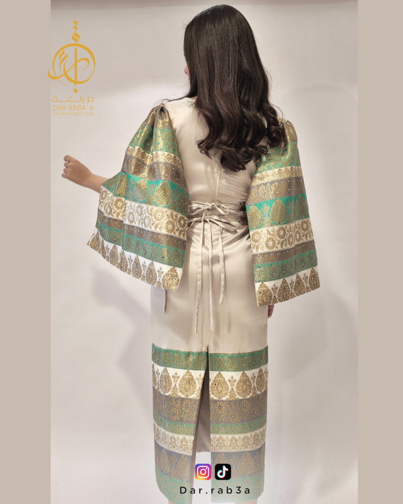 جلابية هندي نسائية تجمع بين الأصالة والحداثة و تصميم مبتكر بأقمشة تفتة تركية عالية الجودة ونقوش جُرُز هندية تقليدية من دار رابعة للازياء.