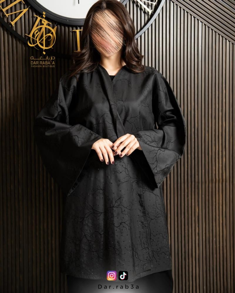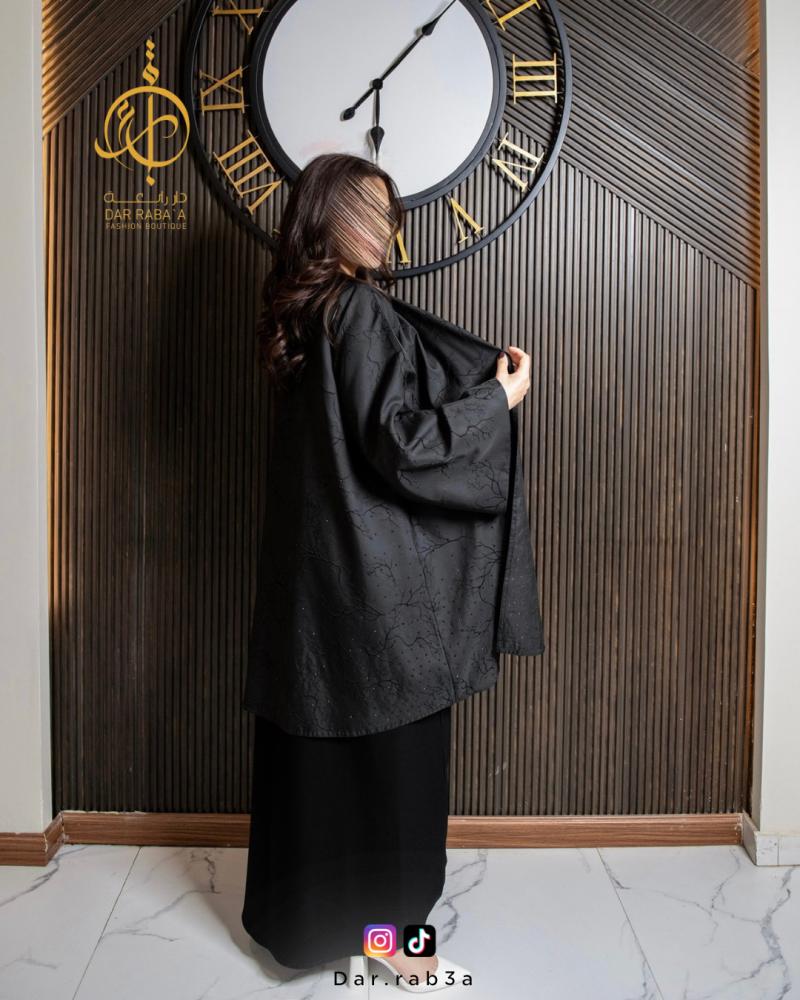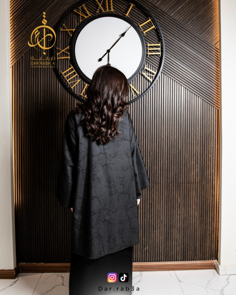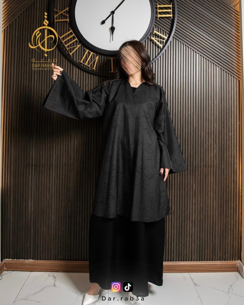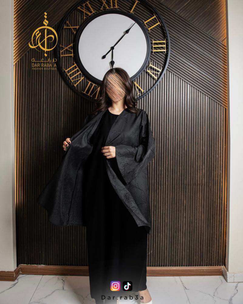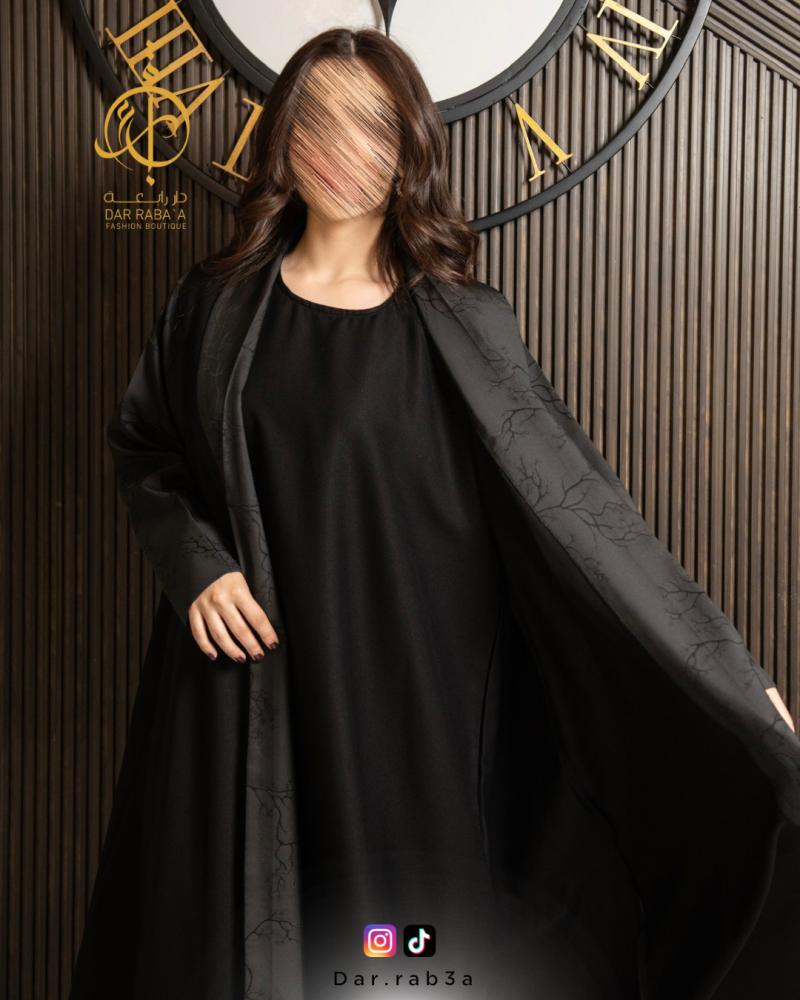عبايه سوداء قطعتين تقدم لكِ تصميمًا عصريًا وأنيقًا مكونًا من جاكيت وجيب فستان و تتميز القصة المستقيمة التي تضفي لمسة عصرية من دار رابعة للازياء.